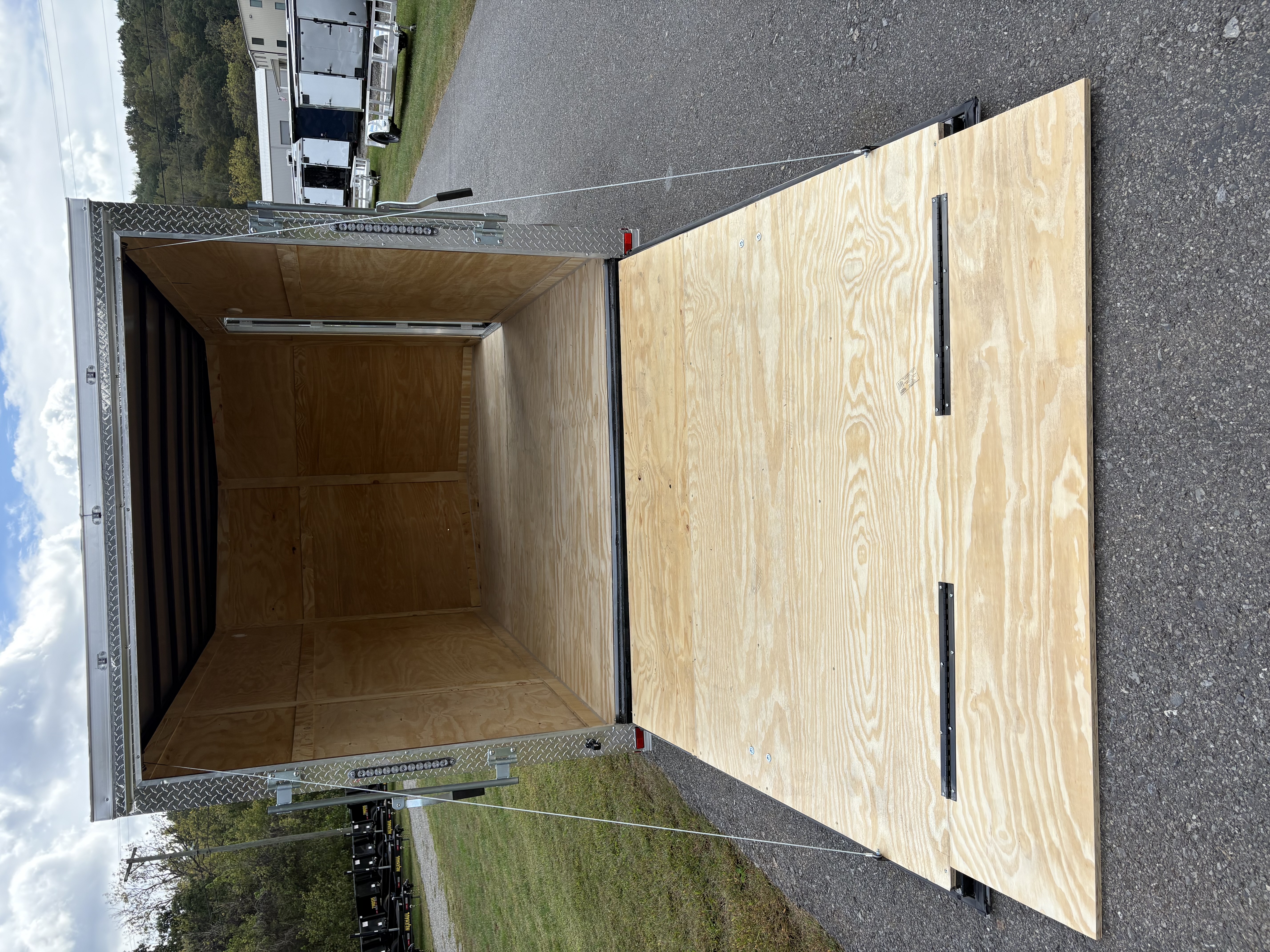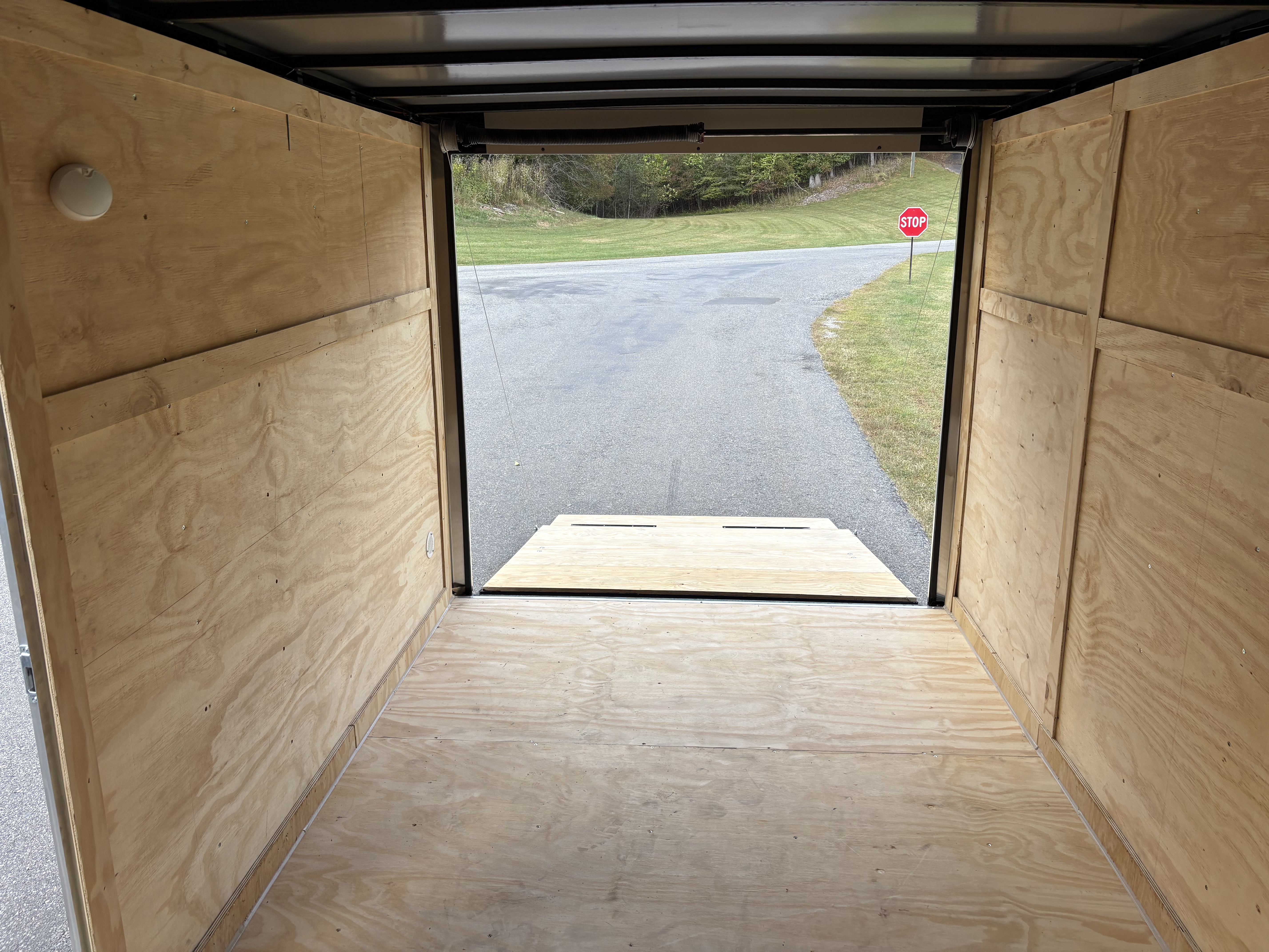Inside, the plywood walls and flooring ensure long-lasting durability, and a 12V dome light keeps the workspace bright. The V-nose with stoneguard improves aerodynamics and protects against road debris, while aluminum fenders, 15” tires, and a Galvalume roof complete the durable, polished build.