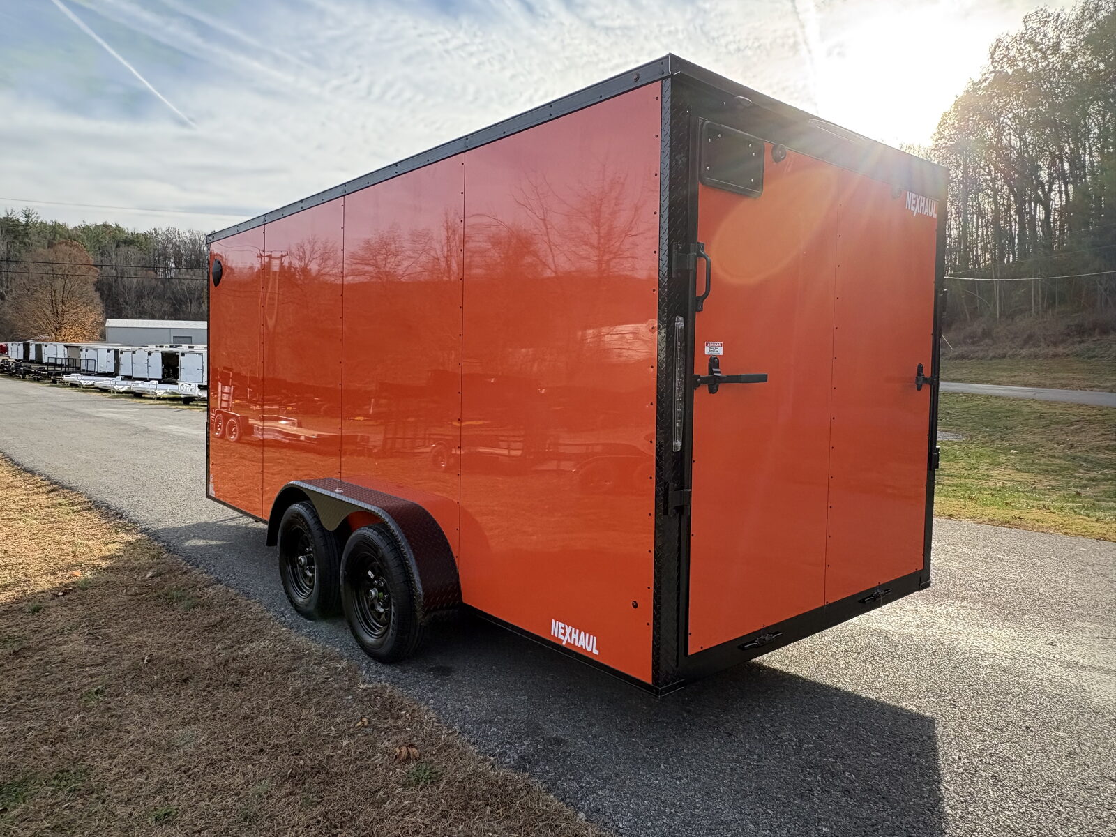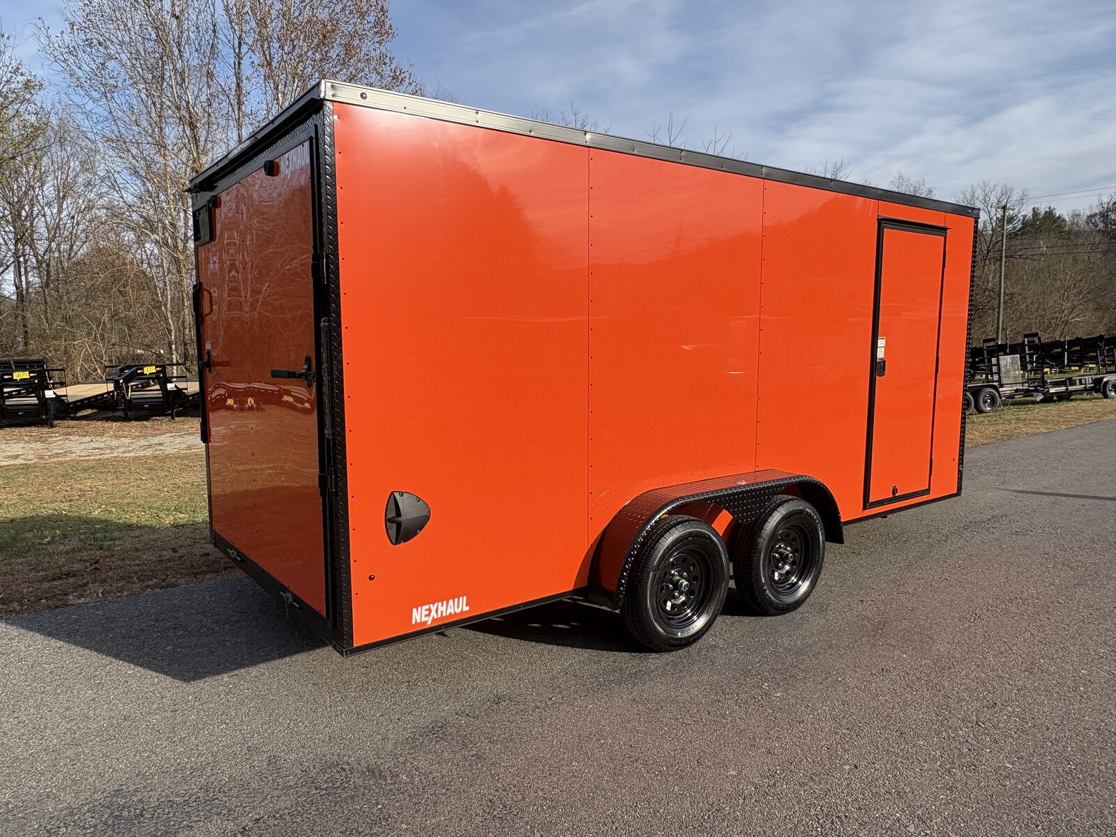 The Nexhaul Bullet Series 7x16 enclosed trailer in bold orange with the blackout package delivers aggressive styling backed by Nexhaul’s proven durability. Designed for contractors, motorsports enthusiasts, and commercial users, this trailer combines premium construction with a high visibility finish that stands out on jobsites, at events, or on the highway.
