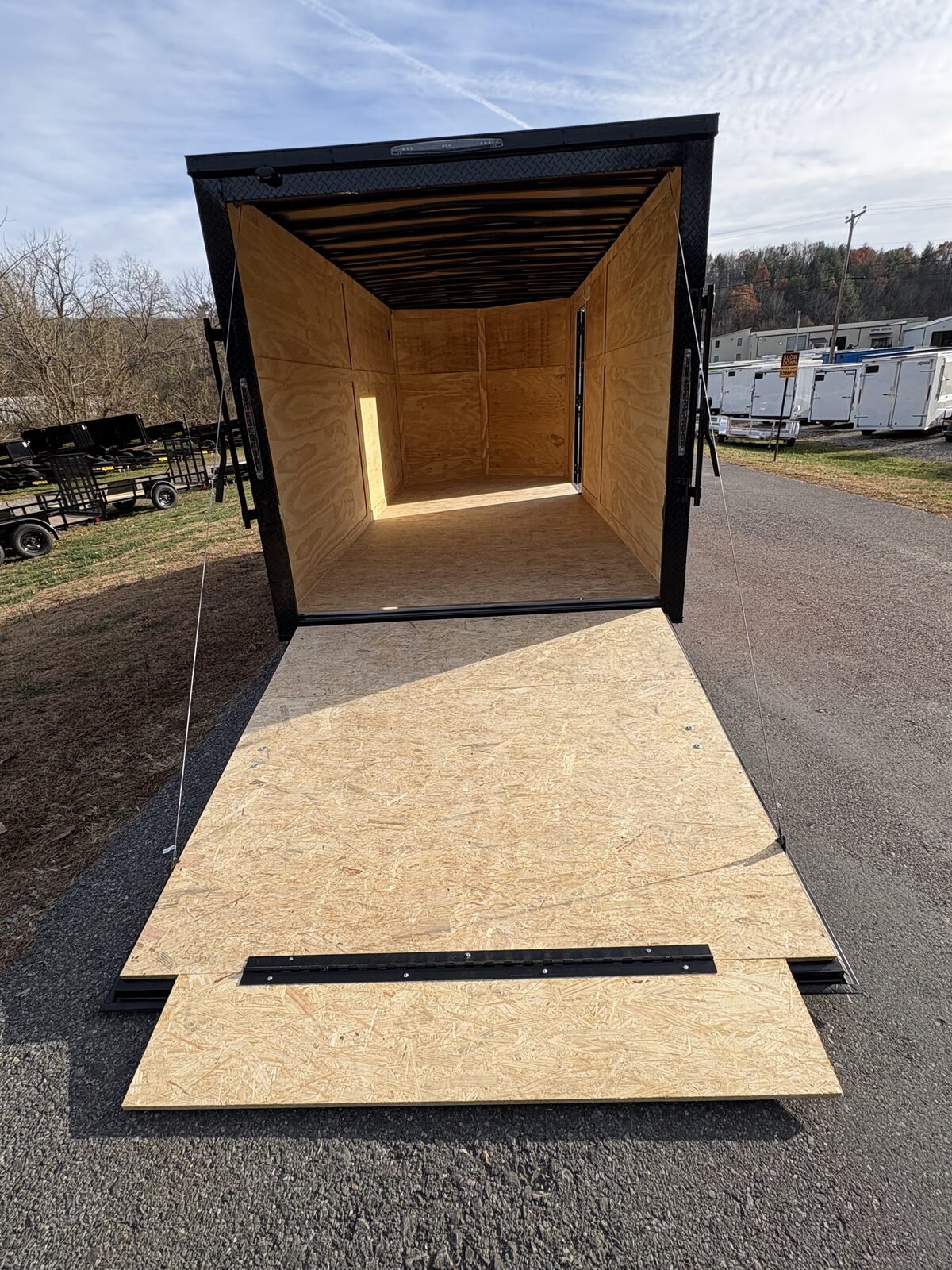 Inside, the 78 inch interior height offers plenty of room for hauling tools, motorcycles, side by sides, equipment, or commercial cargo. Wood interior walls provide durability while plastic side flow vents maintain airflow inside the trailer. A 12V LED dome light keeps the interior well lit for loading and organizing gear.